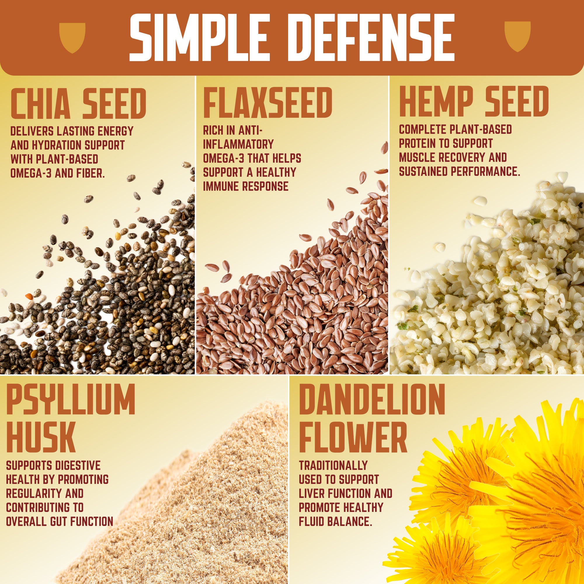 Each Defender Bar features a blend of five plant-based ingredients commonly recognized for their nutrient density and potential functional benefits. Here's a closer look at what’s inside—and why we’ve chosen them.